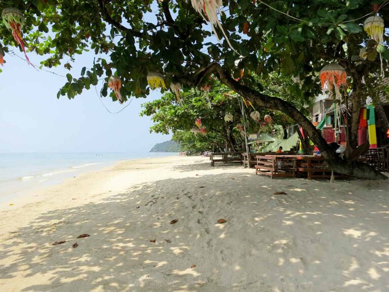 The strip of sand is relatively narrow and backed by a shady thick line of palm and coconut trees, great place for chilling during the day and swim, beach chairs are free to use as long as you order anything from the bar or restaurant. The water is clear and free from rocks. You’ll find a nice mix of backpackers and older tourists, lots of cheap bungalows on offer.